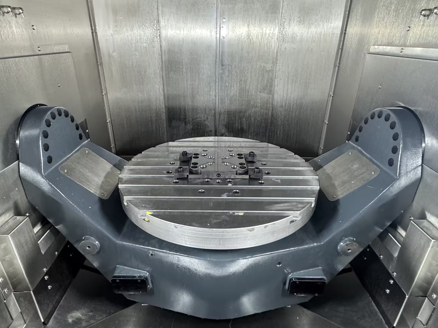 传统五轴加工中心的转台通常采用串联结构,即旋转轴依次叠加。而埃斯科的创新在于采用双轴并联结构,将两个旋转轴的运动机制合并设计,通过直驱电机直接驱动转台,无需中间传动部件。这种设计理念从根本上提高了转台的动态响应和刚性。